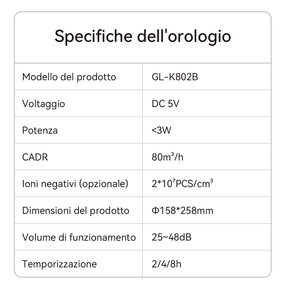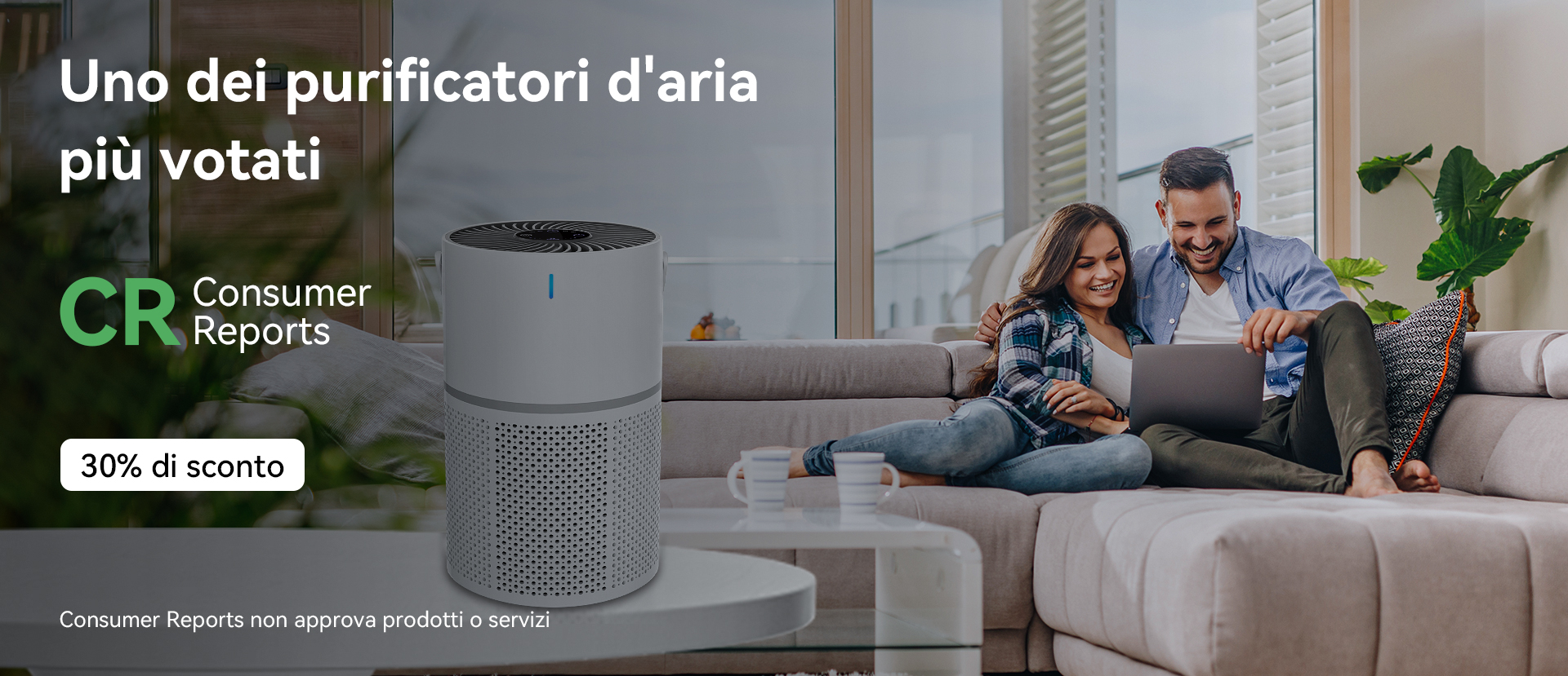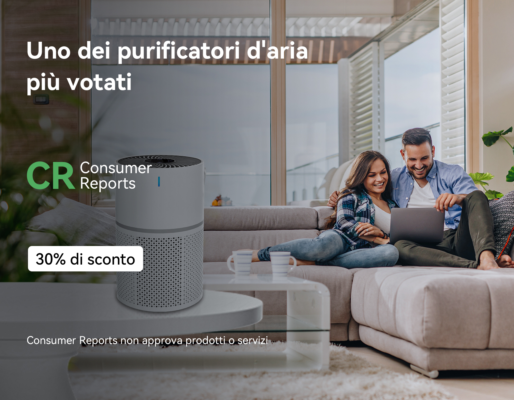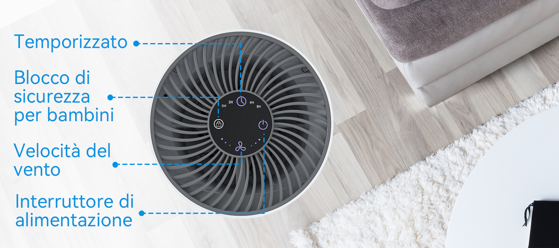 - Purificazione a 360°: Il design con presa d'aria assicura una purificazione completa e accurata dell'aria in tutta la stanza.