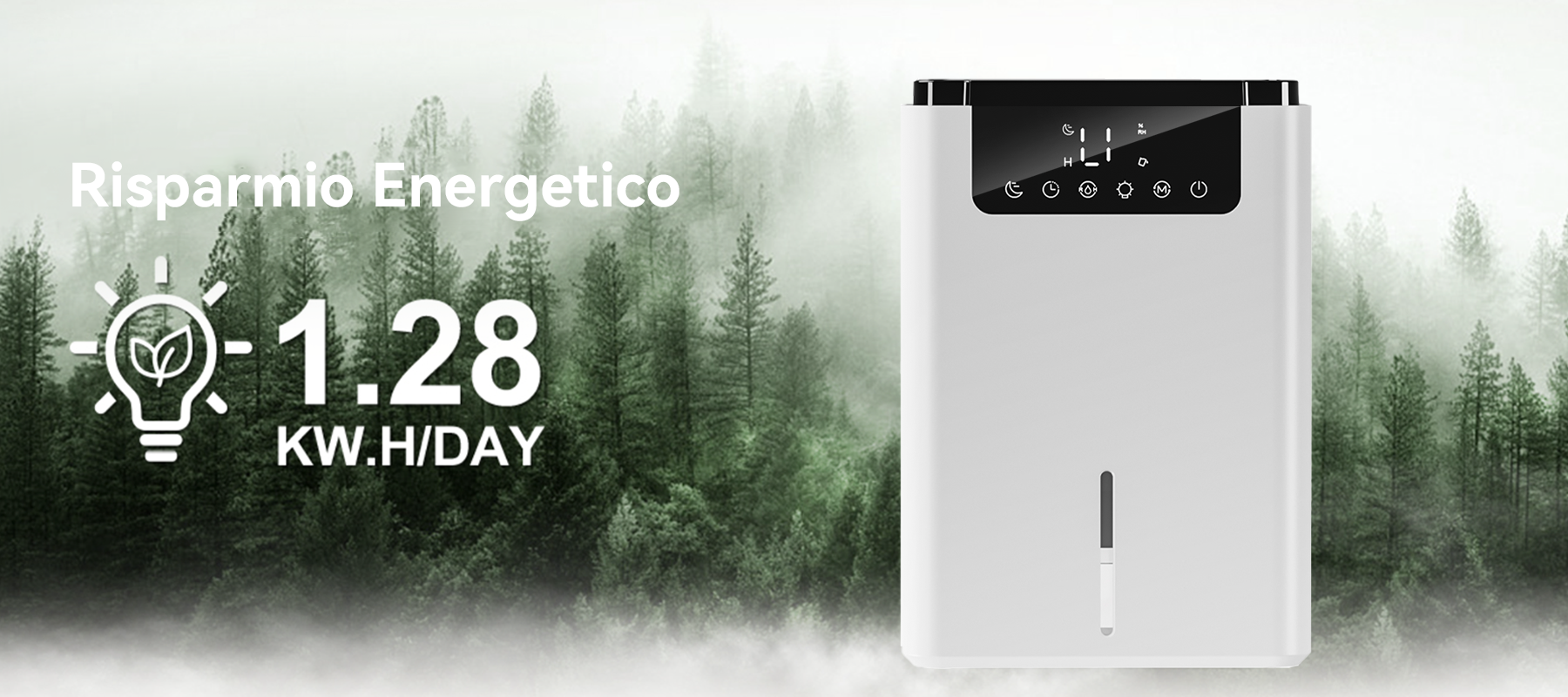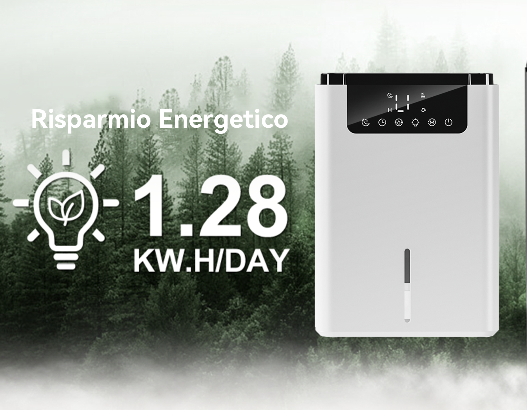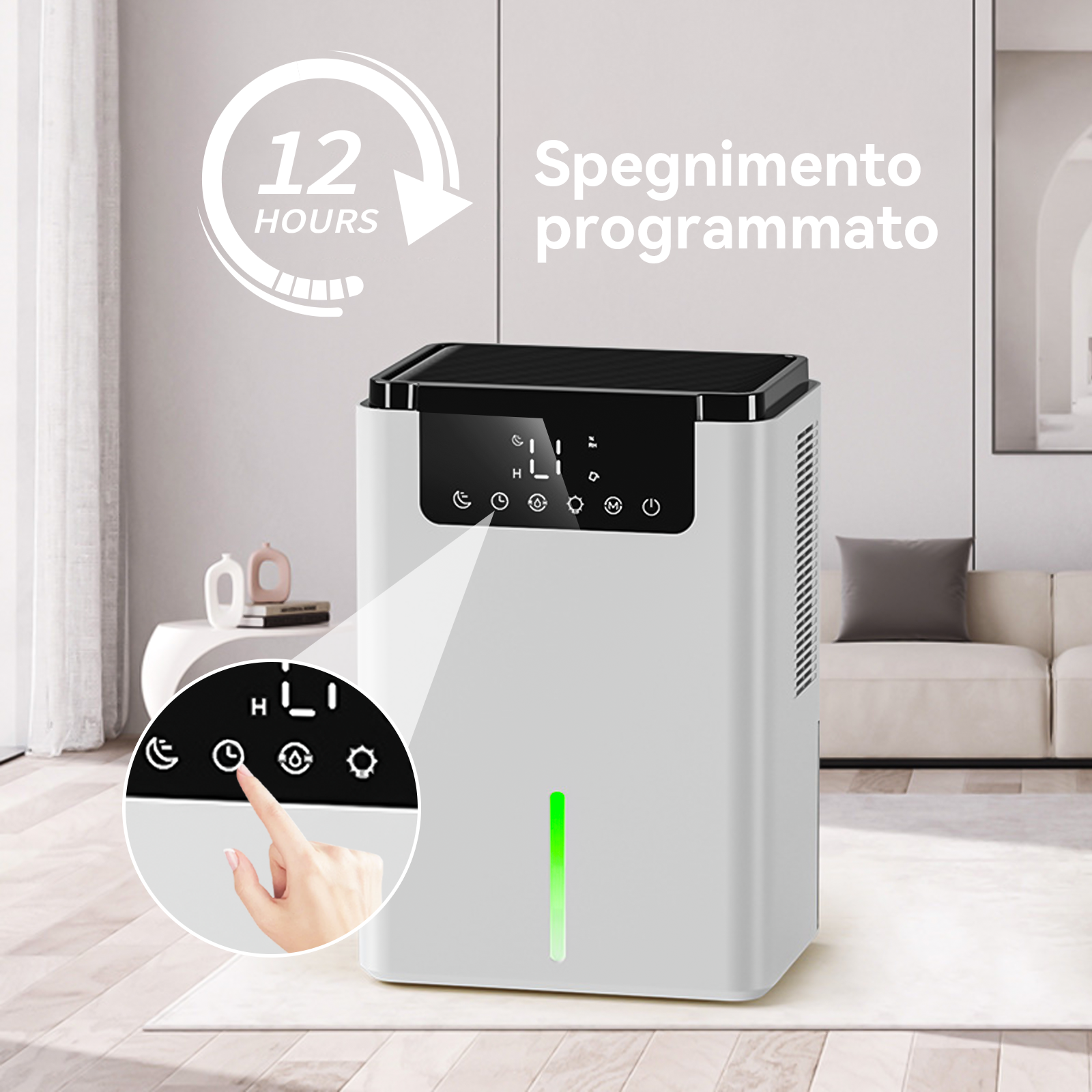 - Controllo Intelligente dell'Umidità - La modalità ECO e un timer di 12 ore regolano automaticamente l'umidità, risparmiandoti fatica ed elettricità.